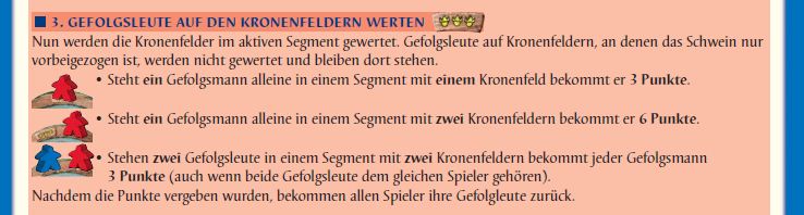 Im zweiten Satz steht "Gefolgsleute auf Kronenfeldern, an denen das Schwein nur vorbeigezogen ist, werden nicht gewertet und bleiben dort stehen."