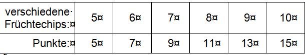 Frey hat geschrieben:Was mich interessieren würde ist, wie Du das Sammeln von 10 verschiedenen Früchten/Gemüsesorten bepunkten willst? Gibt's dann 10er-Sets (wie viele Punkte ist das wert?)? Oder zwei verschiedene 5er-Sets? Oder kriegt man für 5 verschiedene Früchte/Gemüsesorten immer den Setbonus (dann wird es wohl kaum jemals mehr vorkommen, den nicht zu bekommen, wenn man einen 5er-Schritt voll hat)?