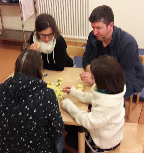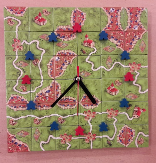 Das Highlight für die Kinder war das Basteln einer funktionierenden Carcassonne-Uhr. Udo hatte im Vorfeld Uhrwerke besorgt und eine große Kiste Carcassonne-Demospiele mitgebracht. Aus jeweils zwei dieser Demospiele wurde die Landschaft gelegt, anschließend auf eine dicke Pappe aufgeklebt. An der Rückseite wurde das Uhrwerk befestigt, ein Loch für die Zeiger gebohrt, die Batterie eingelegt und schon lief die Uhr los. Fehlten nur noch die Zahlen in Form der Gefolgsleute.