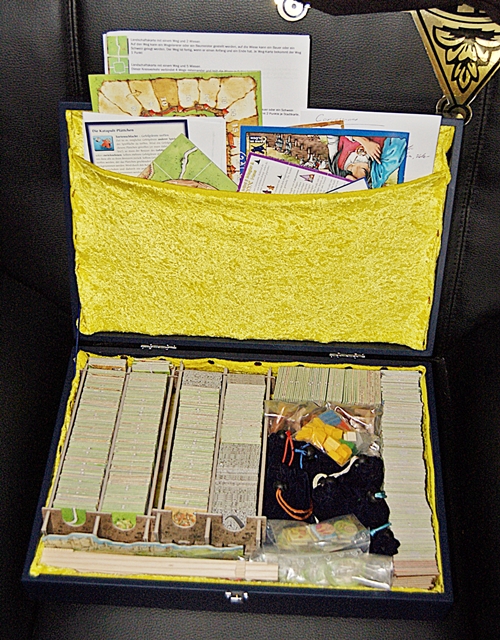 Um alles unterzubringen habe ich den blauen Carcassonne-Koffer umgebaut. Sprich: Das Innenleben rausgerissen und durch gelben Pannesamt ersetzt. Im Deckel habe ich den Stoff doppelt gelegt, so daß dort Platz für Anleitungen, Zählkarte, usw. ist.