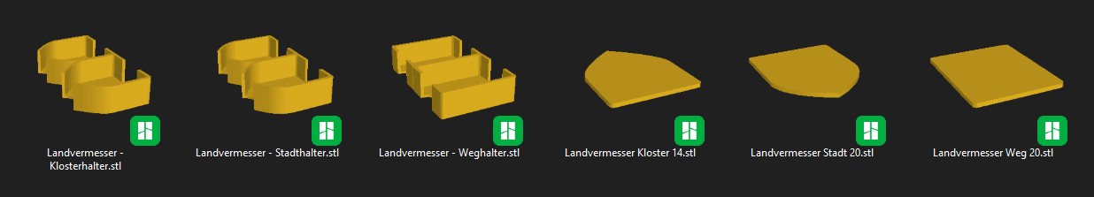 Hier sind Klöster, Städte und Wegekarten. Auf diese können die Landvermesser Klöster, Städte und Wege geklebt werden. Ausserdem sind dabei noch Halter um sie abzulegen oder zu aufzubewahren.