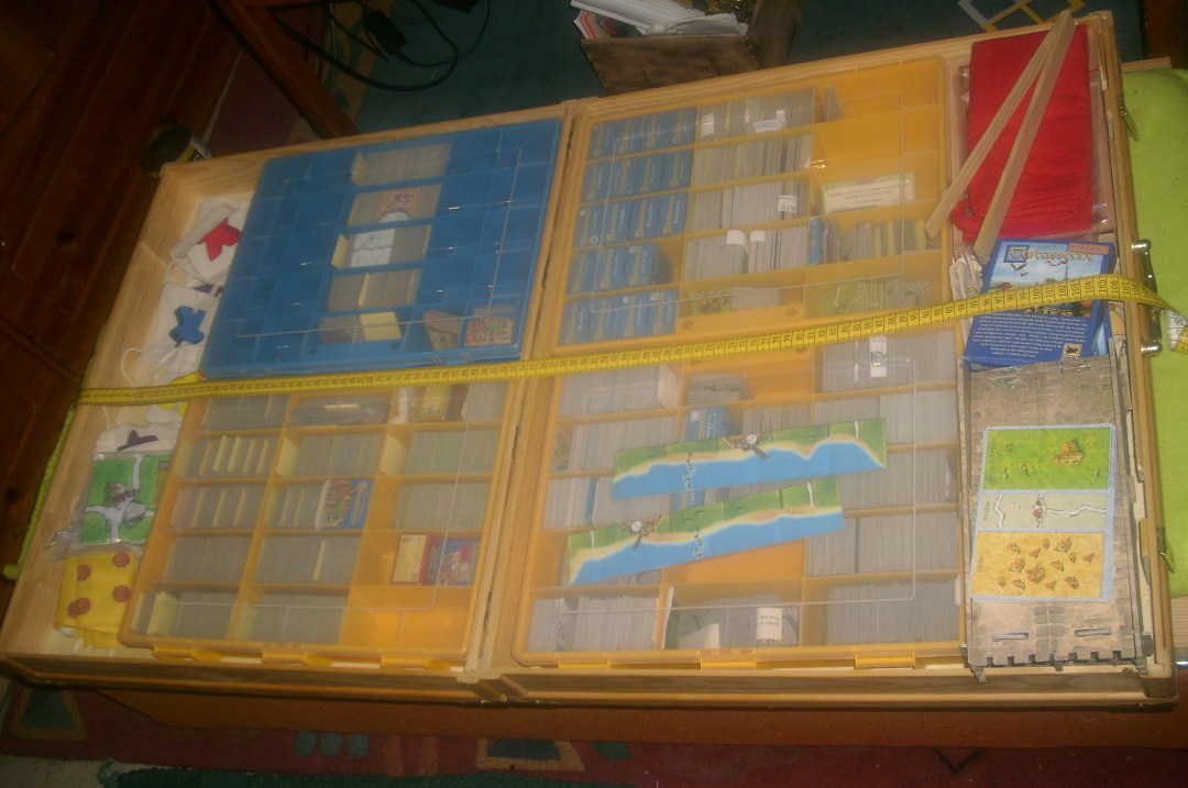 In meinem Koffer sind zusätzlich zum Original Carcassonne HIG,Spielbox noch diverse Fan-Erweiterungen, deswegen hatte ich die BigBoxen aufgegeben (kein Platz mehr) und einen großen Koffer gebaut.