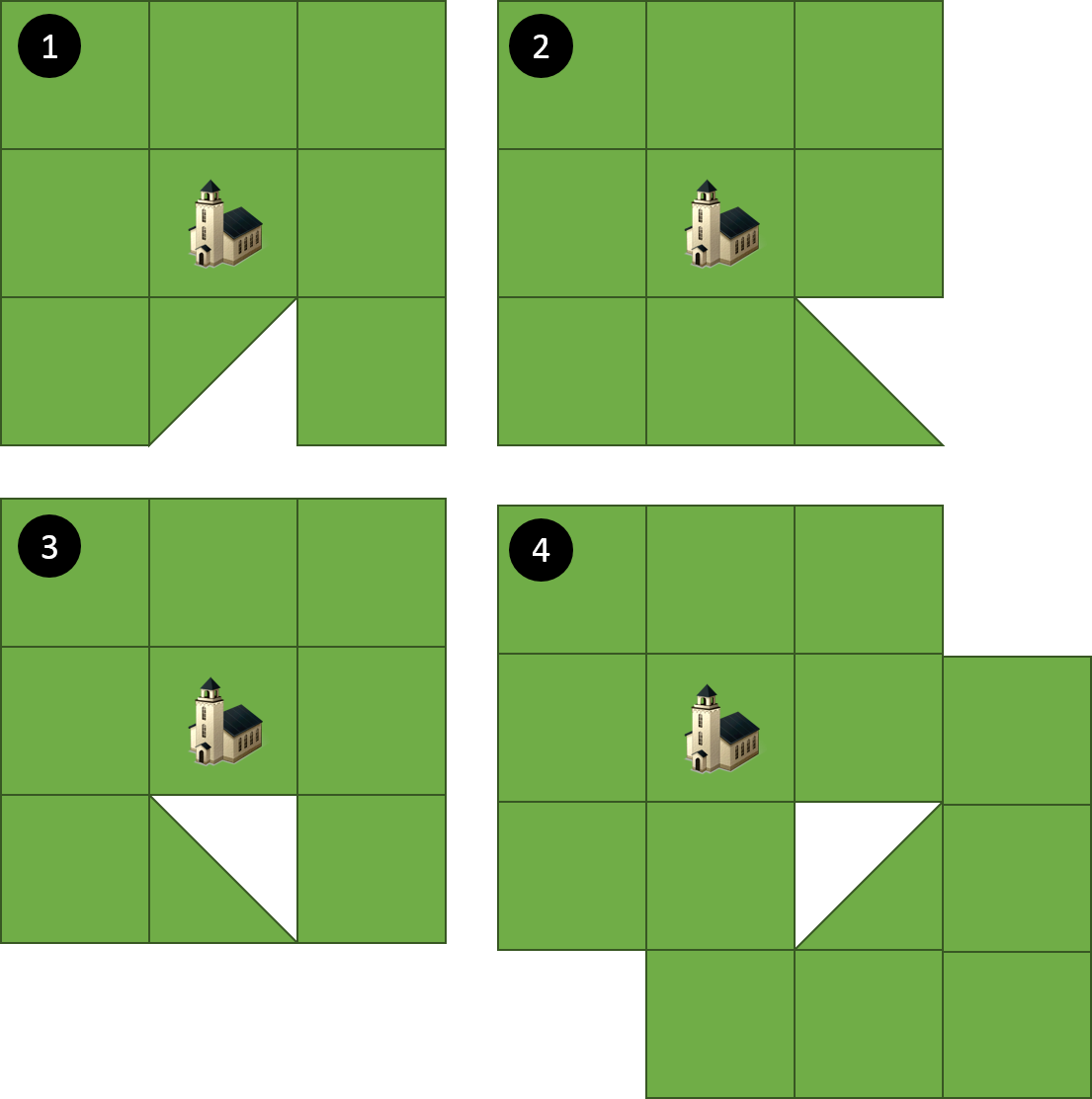 Fall 2 und 3 würden meiner Meinung nach abgeschlossen sein, da die halben Kärtchen das Kloster zumindest mit einer Ecke berühren (mehr tut ein normales Kärtchen in einer Ecke auch nicht). Der vierte Fall ist aber schwierig. Meiner Meinung nach sollte das nicht als abgeschlossen gelten, da das Dreieckskärtchen nicht am Klosterfeld anliegt (nicht einmal mit einer Ecke). Also nicht umliegend ist. Es ist zwar nahe, aber nicht umliegend.