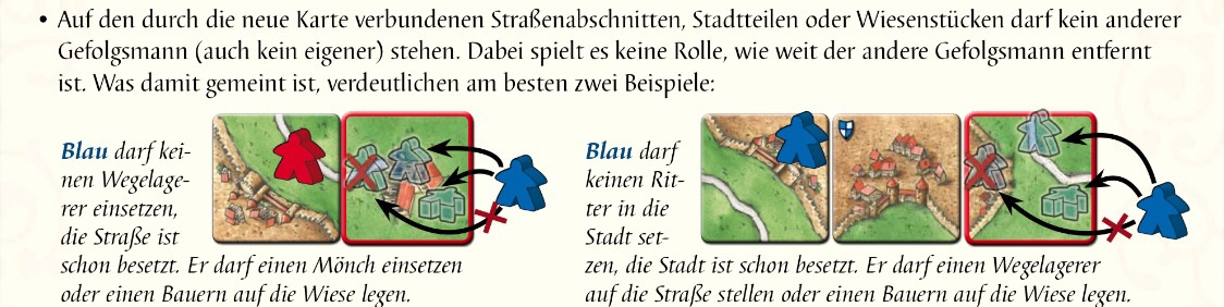Du darfst niemals einen Meeple in ein Gebiet stellen, auf dem schon ein Meeple steht, egal ob es nun deiner oder von einem anderen Spieler ist. Wenn du also deine Position verstärken willst musst du den "Umweg" gehen und ein neues Gebiet beginnen, dort einen Meeple einsetzen und mit deinem alten Gebiet verbinden ...