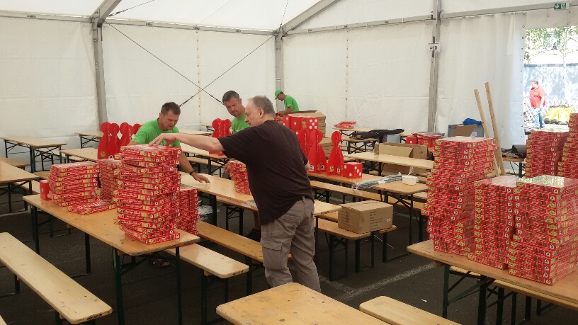 Zurück am Zelt kamen wir gerade rechtzeitig, um das Ausladen der beiden Paletten in Angriff nehmen zu können. Wir haben unzählige Kisten mit Spielen, mit Puzzel-Spielen (am Sonntag findet noch ein großer Puzzel-Städtewettberwerb statt), mit Preisen, mit Werbebannern usw. ausgeladen und im Zelt gestapelt. Glücklicherweise hatte uns das Organisationsbüro drei überaus liebe Kollegen des Bauhofes der Stadt dagelassen, die uns über weite Teile der Vorbereitung geholfen haben. Anders hätten wir diese logistische Herausforderung in der uns zur Verfügung stehenden Zeit kaum bewältigt. Es wurden noch ein paar Tische hin und her geschleppt und als erstes waren die Werbebanner aufzuhängen. Das sah dann so aus: