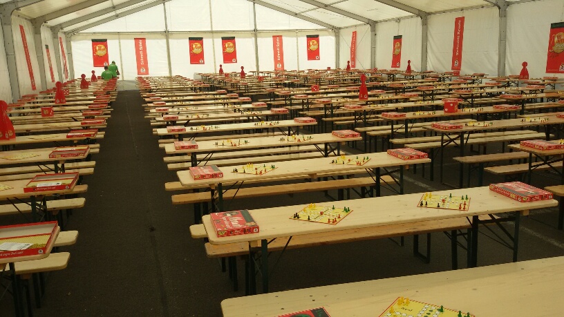 Inzwischen war es fast unbemerkt 13 Uhr geworden, aber der Beginn verzögerte sich etwas, da immer noch Leute ins Zelt kamen, die mitspielen wollten. Inwischen waren nahezu alle Plätze an den Brettern vergeben, so dass noch einige einzelne Spiele aufgebaut werden mussten.