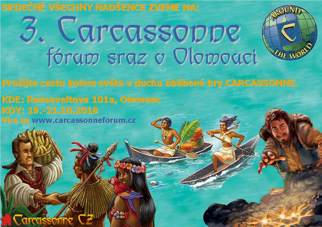 Dovolujeme si Vás tímto srdečně pozvat na již 3. oficiální Carcassonne sraz, který se bude pořádat ve dnech 19.-21.10.2018 v moravské metropoli - Olomouc. Tento rok bude sraz tématicky zaměřen na cestu kolem světa ("Around the World"). Tak neváhejte a prožijte cestu kolem světa v duchu oblíbené hry Carcassonne! Na programu bude tradiční Carcassonne turnaj, pro zájemce workshop výroby herního materiálu včetně kartiček, možnost si zahrát tradiční i netradiční rozšíření, minirozšíření, edice a hlavně se dozvědět více o této skvělé hře, která vládne světu deskových her! Ani tento rok nebude chybět unikátní limitované minirozšíření pro Carcassonne s olomouckou tématikou, které bude dostupné pro každého účastníka srazu.