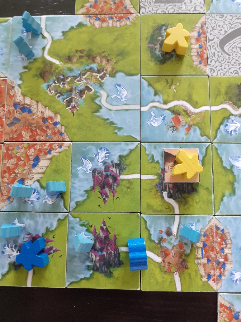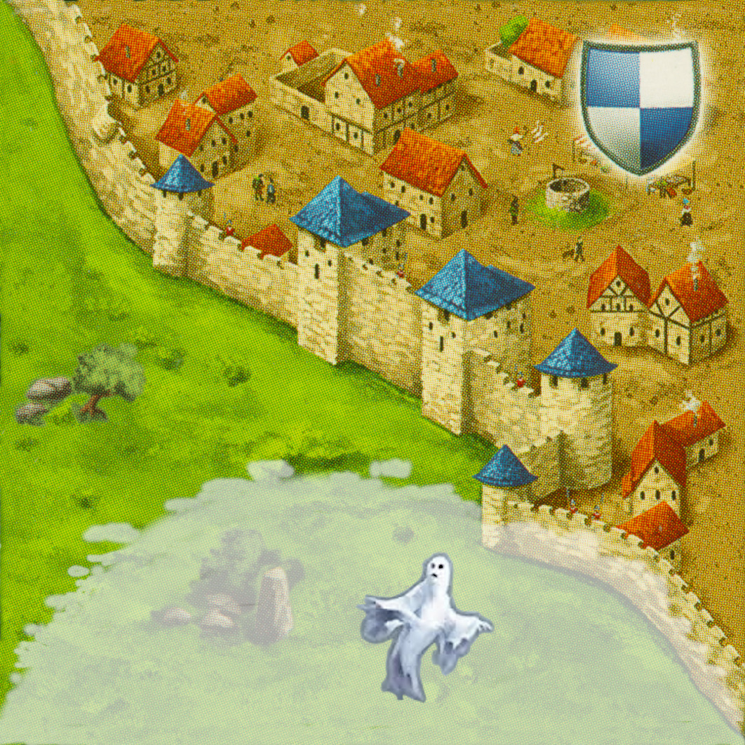 Während der Testphase gab es verschiedentliche Irritationen. Mir gefielen diese umgedrehten Landschaftsplättchen eigentlich nicht, da die Landschaft damit zerstört wird. Aber andererseits bringen diese ein gerüttelt Maß an Schwierigkeit in das Spiel, da damit ja weniger Plättchen zur Verfügung stehen, mit denen man Punkte machen kann. Glücklicherweise wurden diese aktuell nur für die höchsten Schwierigkeiten so ins Spiel genommen. Die Regel ist recht simpel: Solange noch eine Position um einen Friedhof leer ist, muss man in jedem Zug ein Landschaftsplättchen verdeckt, also ohne es anzuschauen, mit der Rückseite nach oben auf eine freie Position neben dem Freidhof legen. Durch den verhexten Friedhof verlieren die Spieler also Landschaftsplättchen, was dazu zwingt, schon den Friedhof möglichst günstig anzulegen. Kommen sehr früh Friedhöfe ins Spiel, muss man möglichweise auf sehr viele Landschaftsplättchen als Punktebringer verzichten.