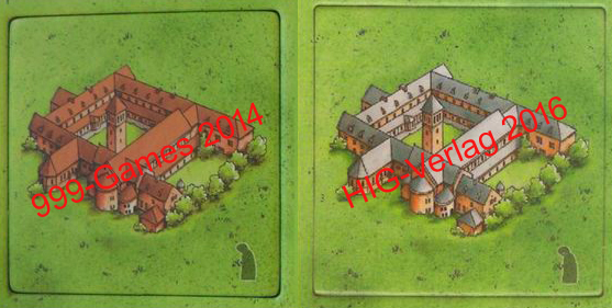 Die Ausgabe von 999-Games ist die frühere Ausgabe, hier entspricht die Darstellung auch eher Bildern der tatsächlichen Abtei. Die HIG-Ausgabe finde ich optisch harmonischer – aber das ist nur persönlicher Geschmack. Einträge auf BGG zeigen je nach Ausgabe auch die angesprochenen Farbunterschiede, so dass ich nicht von einem Einzelfall/Druckfehler ausgehen würde.