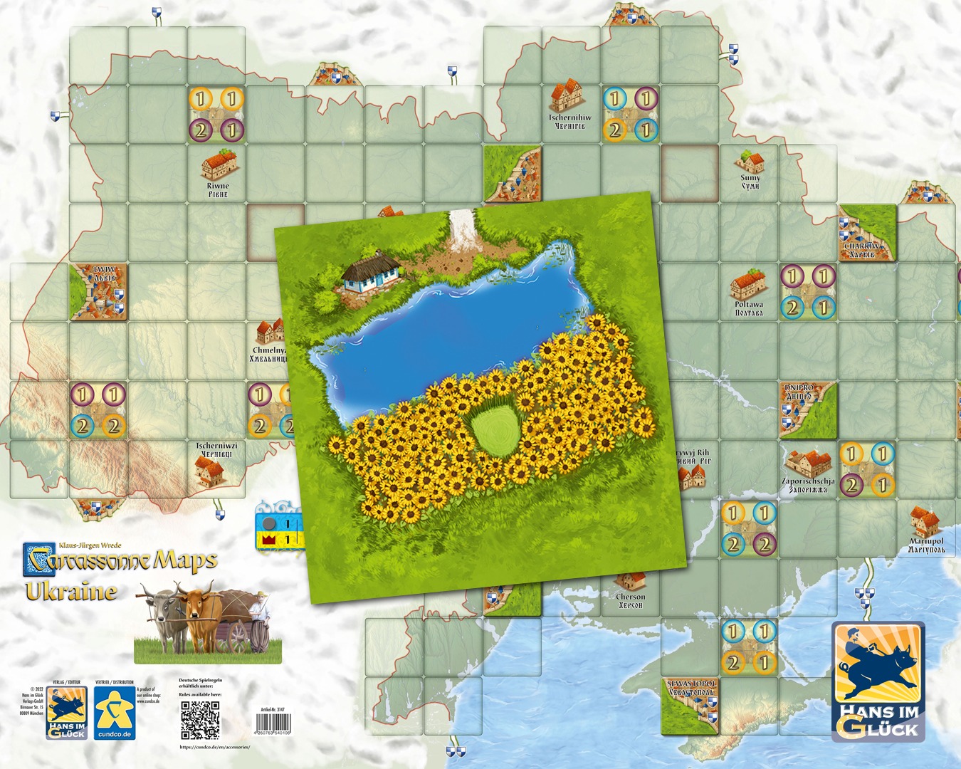 Mit der Ukraine-Map könnt Ihr Eure Plättchen und Meeple in der Ukraine einsetzen und ukrainische Großstädte sowie wichtige Straßenverläufe mitbestimmen: