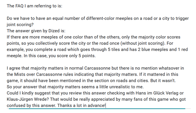 Ich bin da jetzt echt verwirrt, weil in den gesamten Regeln von Nebel über Carcassonne das Konzept der "Mehrheit" auf Straßen und in Städten nicht eingeführt wurde.