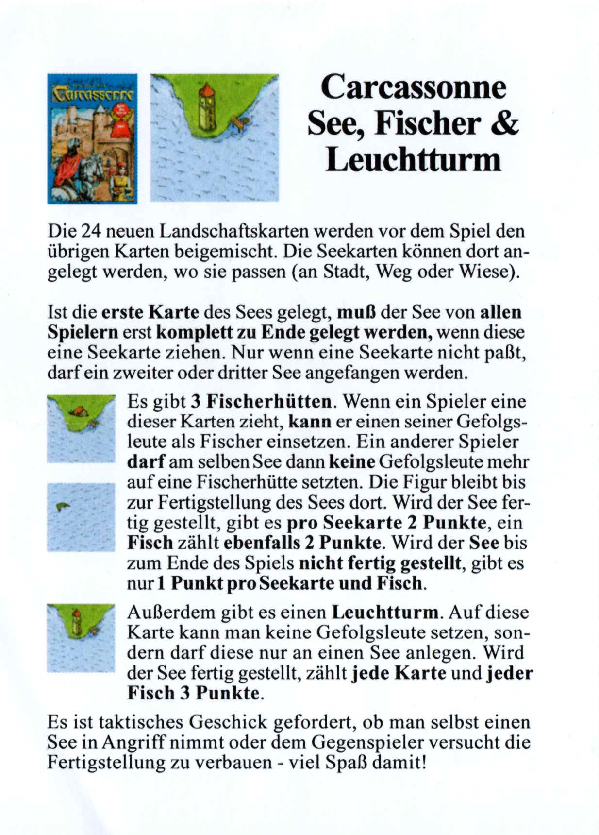 Die 24 neuen Karten werden vor dem Spiel den Karten beigemischt. Jetzt kommt zum Spiel noch der See mit Fischerhütten und Leuchtturm hinzu und es ist taktisches Geschick gefordert, ob man selbst einen See besetzt oder dem Gegenspieler versucht die Fertigstellung zu verbauen. Zum Schluß zählen schließlich nur die Punkte für Seekarten, Fische und den Leuchtturm!