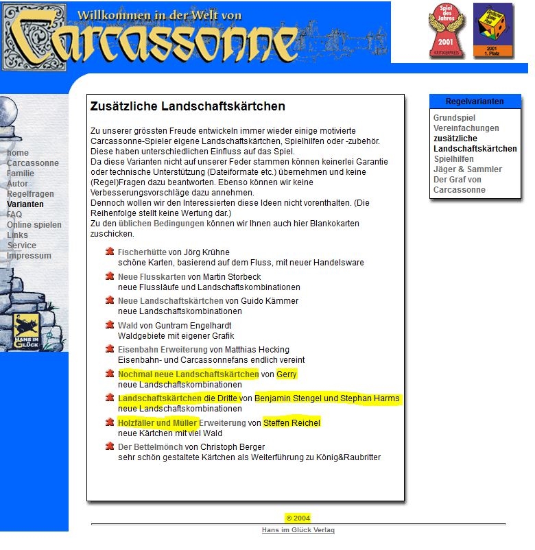 Dabei habe ich auch die alten HiG-Webseiten "ausgegraben" und dadurch für Dich ein paar Ergänzungen zu Kapitel 4 "Carcassonne Fan-Erweiterungen":