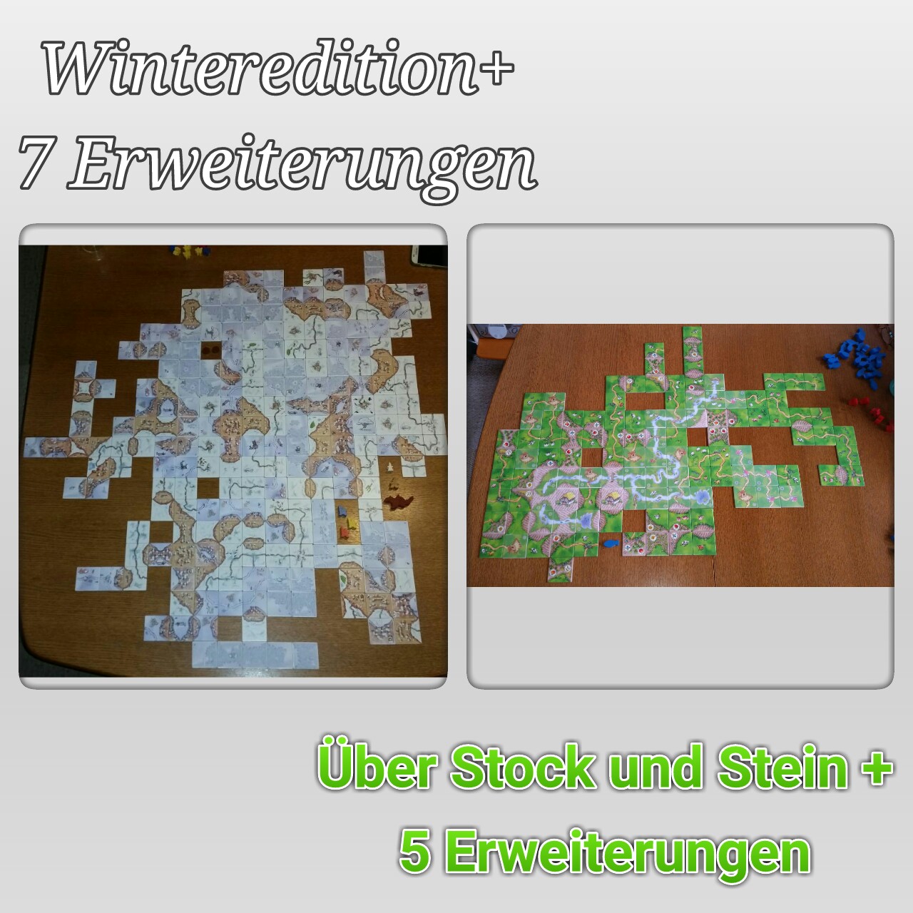 Für die Winteredition: Die Wälder von Carcassonne, das Fest, die Kornkreise, Lebkuchenmann, Brunnen, Schafe und Hügel und Burgfräulein und Drache.