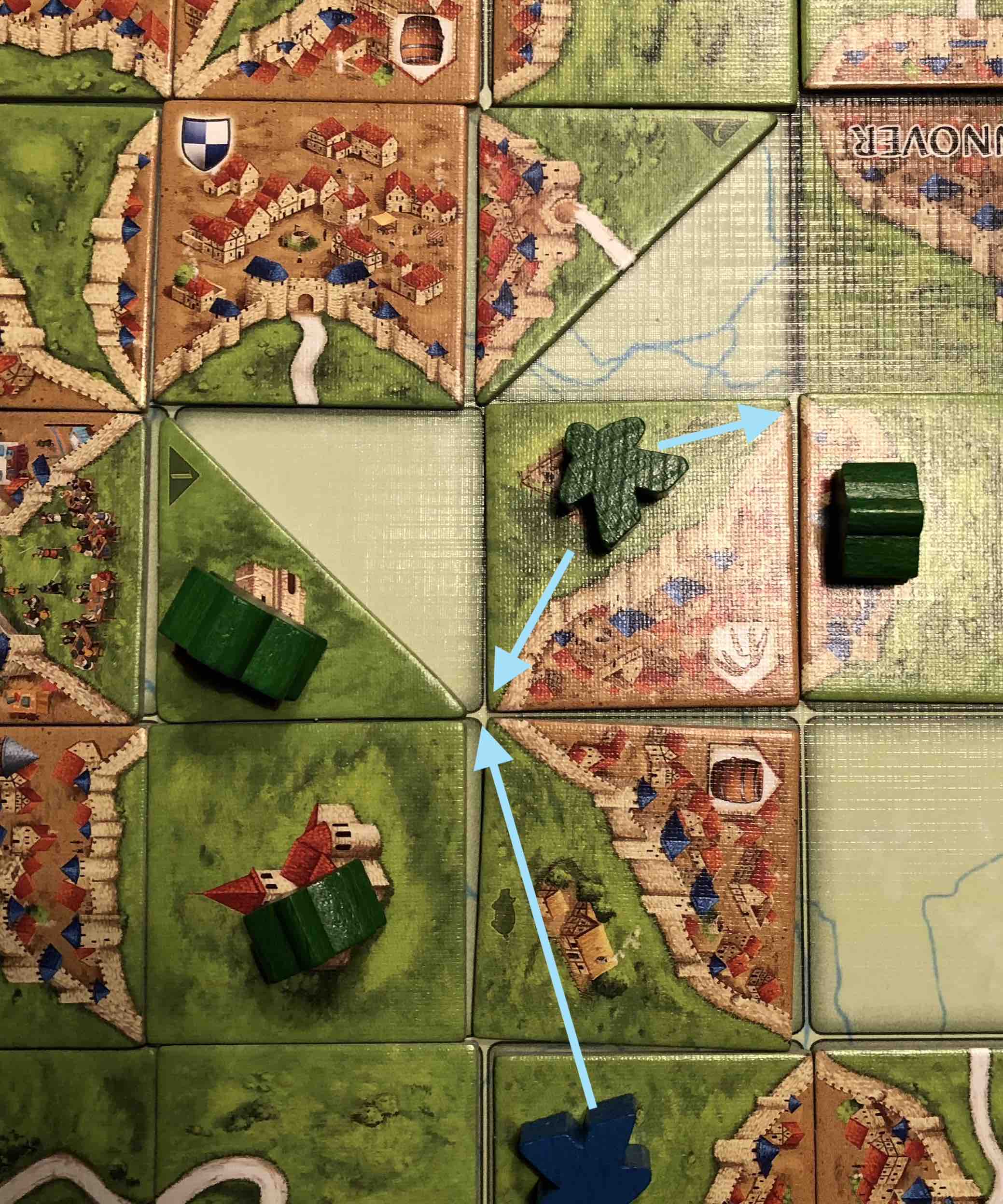 Hat der grüne Meeple Anschluss an irgendeine Wiese und liegen deswegen der blaue und der grüne Meeple auf einer Wiese?
