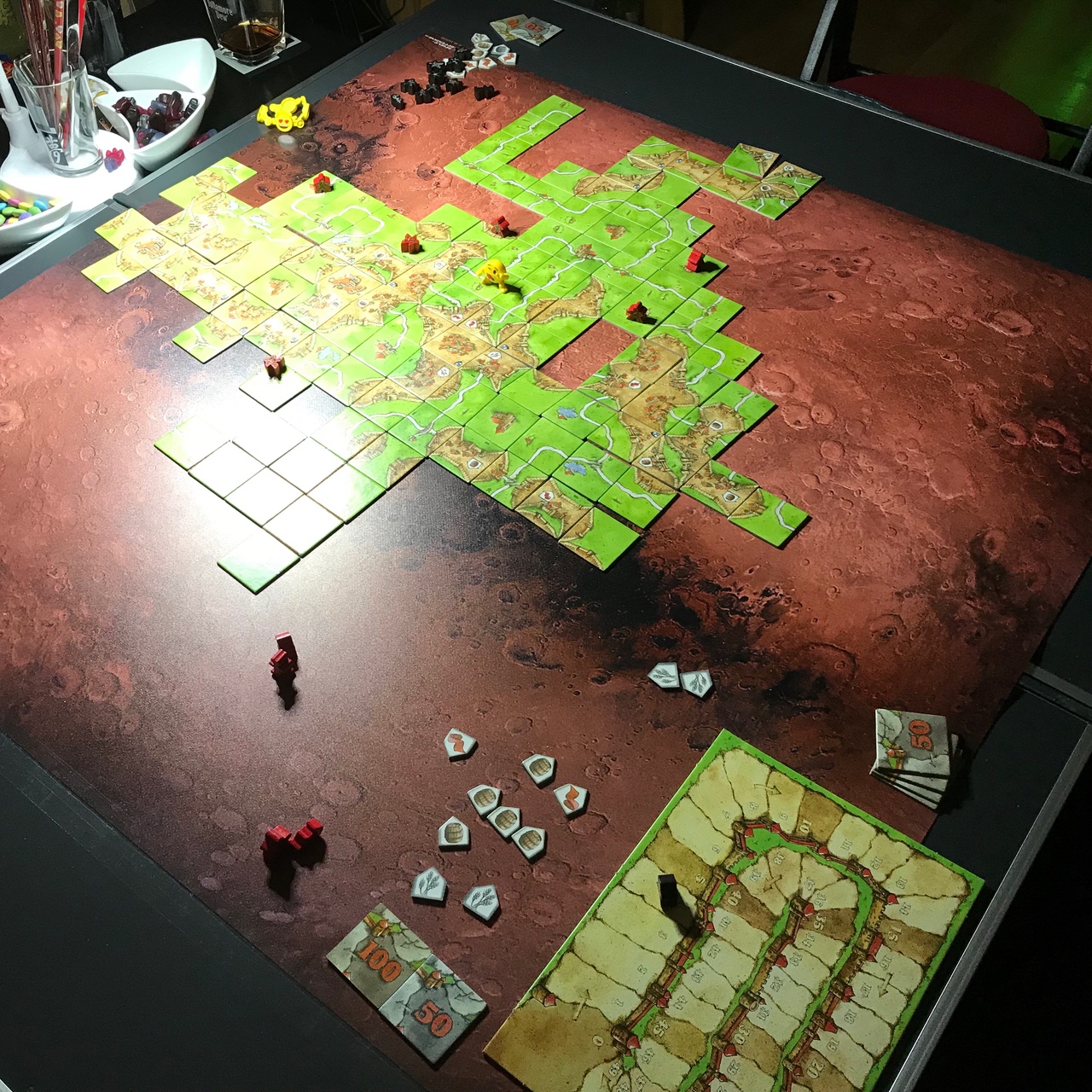 BTW: Ich musste hier Platz- und Tischmässig etwas improvisieren und habe als Spieltisch 2 Tapeziertische zusammengeschoben. Da diese u.a. einen kleinen leicht erhobenen Rand haben, habe ich meine vorhandene Spielmatte ausgebreitet und... Naja, ich hab sie eigentlich für „Doom“ gekauft weswegen sie das Motiv der Marsoberfläche hat. Dies rief bei uns beiden den Gedanken hervor dass wir gerade Terraforming betreiben und den Mars kolonialisieren. Zeitlich nicht unbedingt die Carcassonne-Thematik, aber egal. :