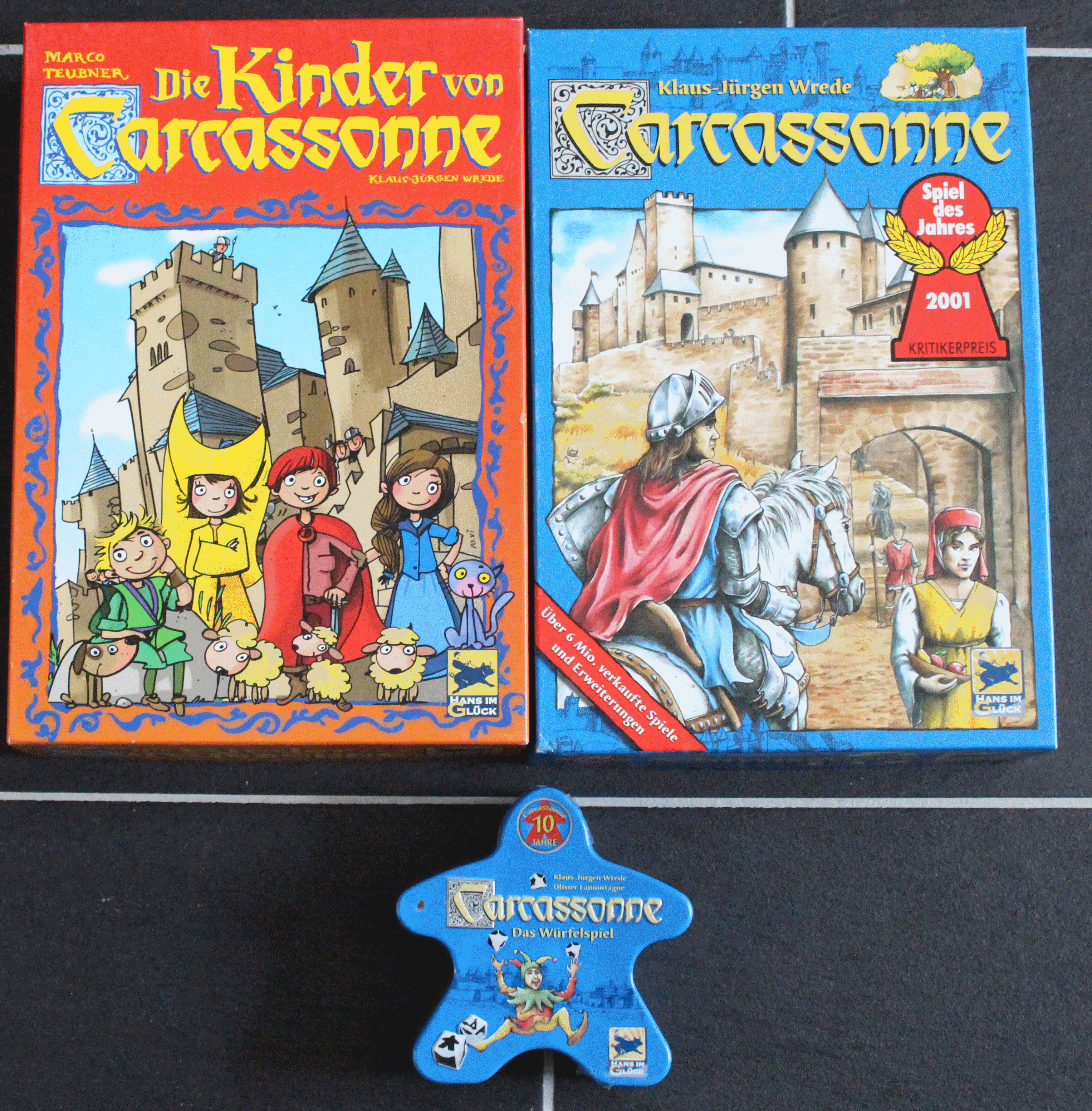 Eigentlich war ich nur auf der Suche nach einem guten gebrauchten Kinder von Carcassonne, um es mit meinen jüngeren Enkeln spielen zu können, wenn sie uns besuchen. Ich weiß, das ist anfixen, aber bei unserem Lieblingsspiel kann man nie früh genug damit beginnen! Und dabei bin ich über dieses nette Bundle gestolpert. 3,83 € - ich bin ja so schwach und konnte dann ebenfalls nicht widerstehen. Auch noch ein richtiges Carcassonne für kleine Hände.