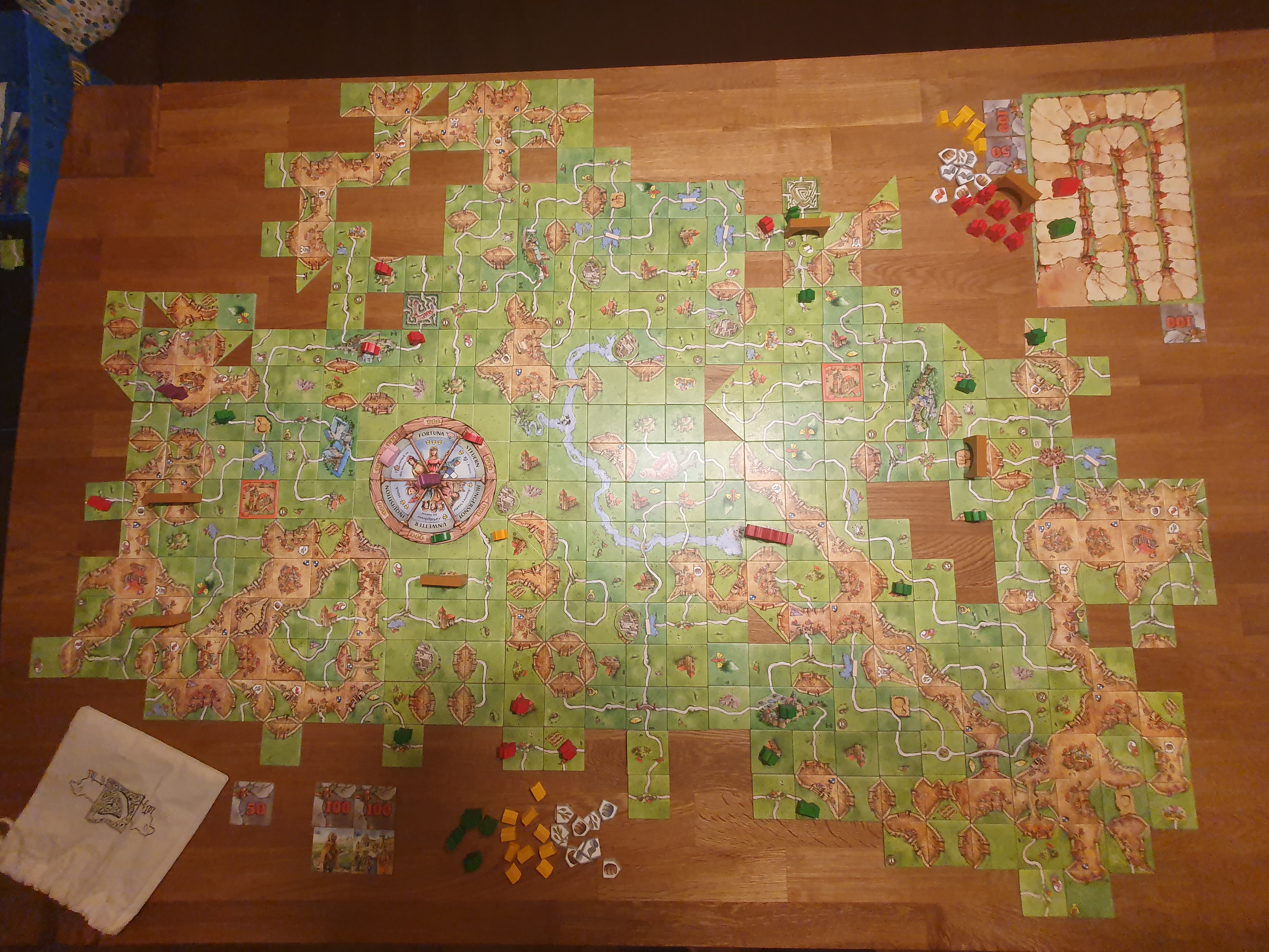 Unser letztes Spiel war: Basisspiel, Kornkreise, Flüsse, Abt, Fluggeräte und die größeren Erweiterungen Kathedralen und Wirtshäuser und Händler und Baumeister. Mal sehen welche Minierweiterung wir als nächstes noch dazu nehmen. Vllt werden wir auch etwas wegnehmen müssen, denn für unseren Geschmack werden die Runden schon ein wenig lang.