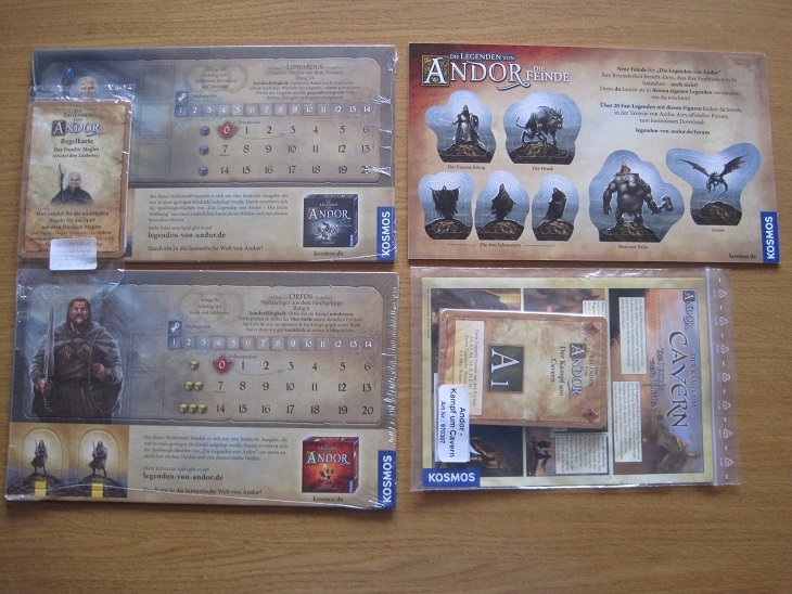 Zu deiner Frage: Mhhh...die Feinde sind recht schwer zu erhalten, da es ingesamt nur unter 100 Stück im Stanzbogen gibt. Im Andor Forum sucht Phéagôn noch die Erweiterung Kampf um Cavern, welche er gegen das Feinde-Tableau tauschen würde. Ansonsten würde ich dir einfach raten, immer mal wieder auf Facebook oder im Andor-Forum vorbeizuschauen, da es dort regelmäßig Gewinnspiele gibt. Zu kaufen oder auf Messen gibt es diese nicht.