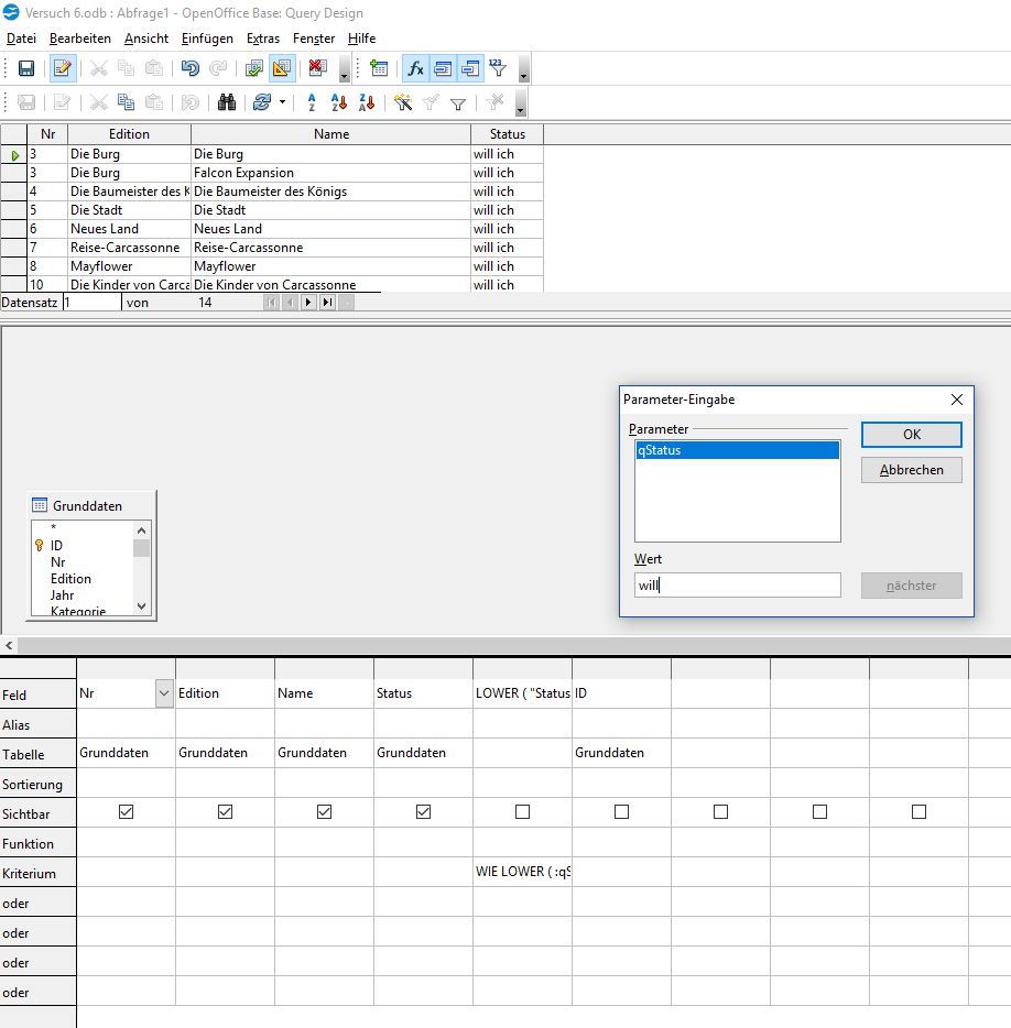SELECT "ID", "Nr.", "Anzahl", "Edition", "Ausgabe", "Kategorie", "Besonderheiten", "Zugabe", "Wertungstafel", "Figuren", "Plättchen", "Symbol", "Verlag", "Jahr", "EAN / GTIN", "Barcode", "Autor", "Grafik", "Alter", "Spieler", "Dauer", "Preis", "Status" FROM "Tabelle1" WHERE LOWER("Edition") like LOWER(:qEdition||'%')
