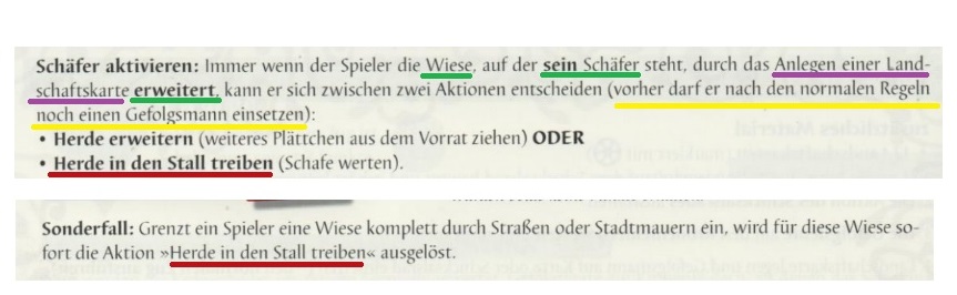 Der Ausnahmefall "die Wiese ist fertiggestellt" steht nur deshalb in der Spielanleitung, weil auch ein anderer Spieler die Wiese fertigstellen kann: Selbst dann wird die Herde eingetrieben und man hat die Chance, seinen Schäfer noch einmal zu benutzen. Dieser Ausnahmefall fehlte in der ersten Spielanleitung für die 9. Erweiterung, als diese auf den Markt kam. In der BigBox wurde die Anleitung dann ergänzt.