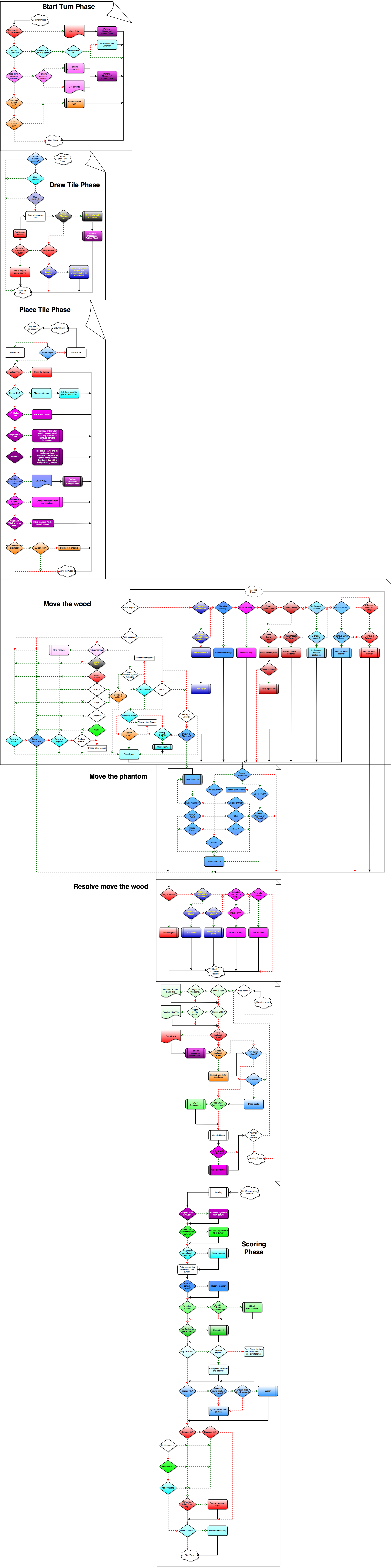 Übersichtlichkeit: Die Idee hinter den Farben war, die einzelnen Expansionen zu trennen, da ja nicht jeder in der glücklichen Lage ist alle Editionen zu haben bzw damit zu spielen. Eigentlich hätte ich es gern so, dass man auswählt welche Expansionen man spielen will und dann der Ablauf dementsprechend aufgebaut wird.Rot und Grün für die Pfeile habe ich genommen, da das jede Menge Yes/No einspart. Falls man das irgendwann dynamisch macht, könnte man das optional einblendbar machen.