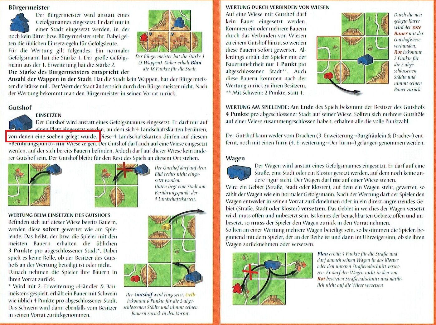 Ich fand's nicht unlogisch, den Gutshof auch woanders zu platzieren. Im Regelheftchen steht diesbezüglich nichts drin und in der dazugehörigen Abbildung ist auch kein roter Rahmen um das soeben gelegte Plättchen, wie es sonst meist der Fall ist. Außerdem fehlt bei den Gutshof-Regeln sowieso das 1. Kapitel ("Plättchen legen").