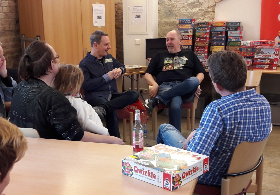 Interessant war das für mich auch noch aus einem anderen Grund: Thorsten Gimmler, Senior Product Manager (verantwortlicher Spieleredakteur) bei Schmidt-Spiele hatte sein Kommen zugesagt. Er hat einen interessanten Vortrag über die Verlagsarbeit und über Spielentwicklung gehalten. Und nicht nur das, dabei war auch das soeben frisch erschienene "Die Quacksalber von Quedlinburg", ein Strategiespiel, das er kurz vor seiner Abreise am Freitag in zwei Exemplaren noch schnell aus den Paketen von der Druckerei gezogen hatte. Im Handel wird es dann sicher gegen Monatsende verfügbar sein. Und vielleicht am Wichtigsten: vier große Taschen mit geschätzten 15 Prototypen, die getestet werden konnten. Doch dazu vielleicht in einem zweiten Beitrag, ich muss noch klären, was ich dazu alles so schreiben darf.