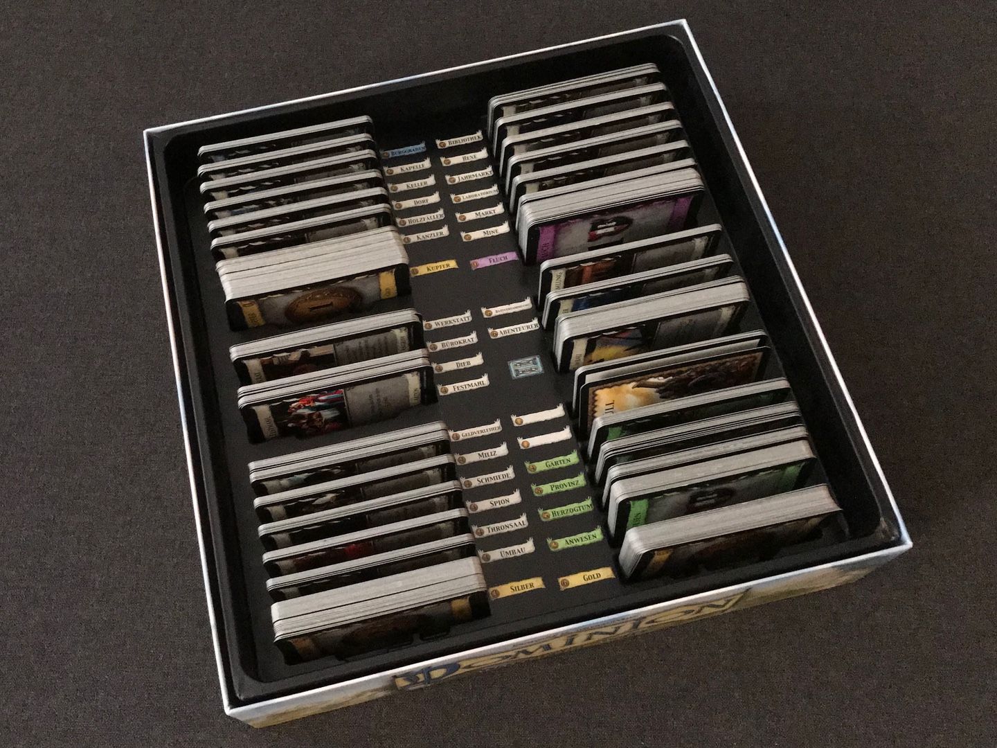 Als „Trostpflaster“ das 2 Karten fehlen, lege ich genug Basiskarten mit rein so dass man das Spiel auch zu 5. oder 6. spielen kann. Sprich: Es sind zusätzlich 30 Goldkarten, 20 Fluchkarten und 6 Provinzkarten mit in der Box.