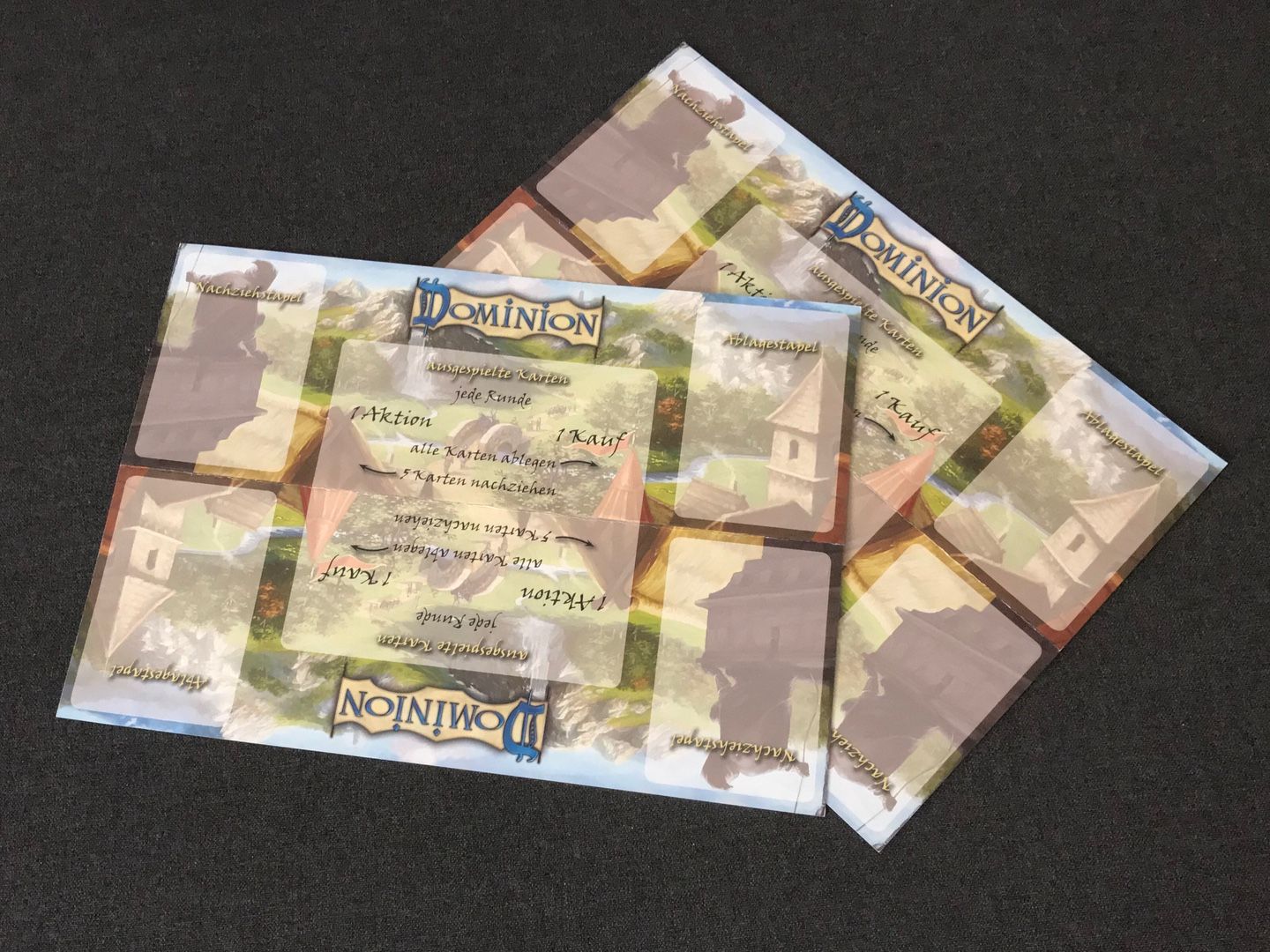 Wem das noch nicht reicht: Ich lege auch noch einen Satz Spielertableaus mit rein. Diese bestehen aus dickem Hochglanzpapier und sind mittig perforiert. Ich weiß nicht wo sie ursprünglich herkommen aber es sind nicht die aus den beiden alten SpielDoch Magazinen. Die hätten auf der Rückseite nämlich das Tableau in englisch, während meine auf der Rückseite nur Werbung für Seaside und (glaube ich) Die Intrige haben.