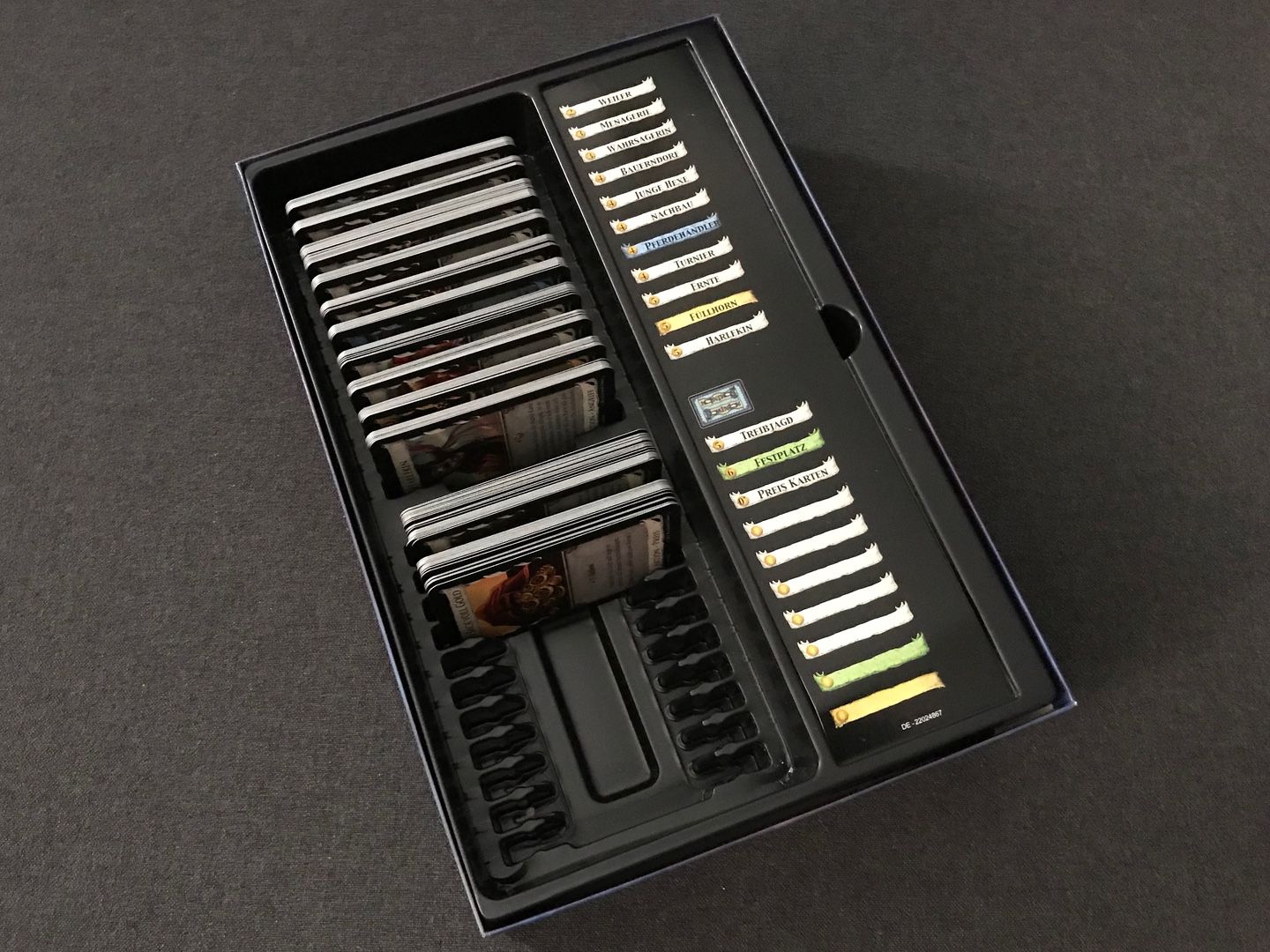 Es hat Gebrauchsspuren, ich würde den Zustand aber als gut einstufen. Es handelt sich hier um die alte Version von Hans im Glück. Spiel ist NICHT komplett. Es fehlen 2 der 10 Karten des Königreichs „Werkstatt“. Da man aber immer mit 10 unterschiedlichen Königreichen spielt, ist das Spiel nach wie vor sehr gut spielbar.