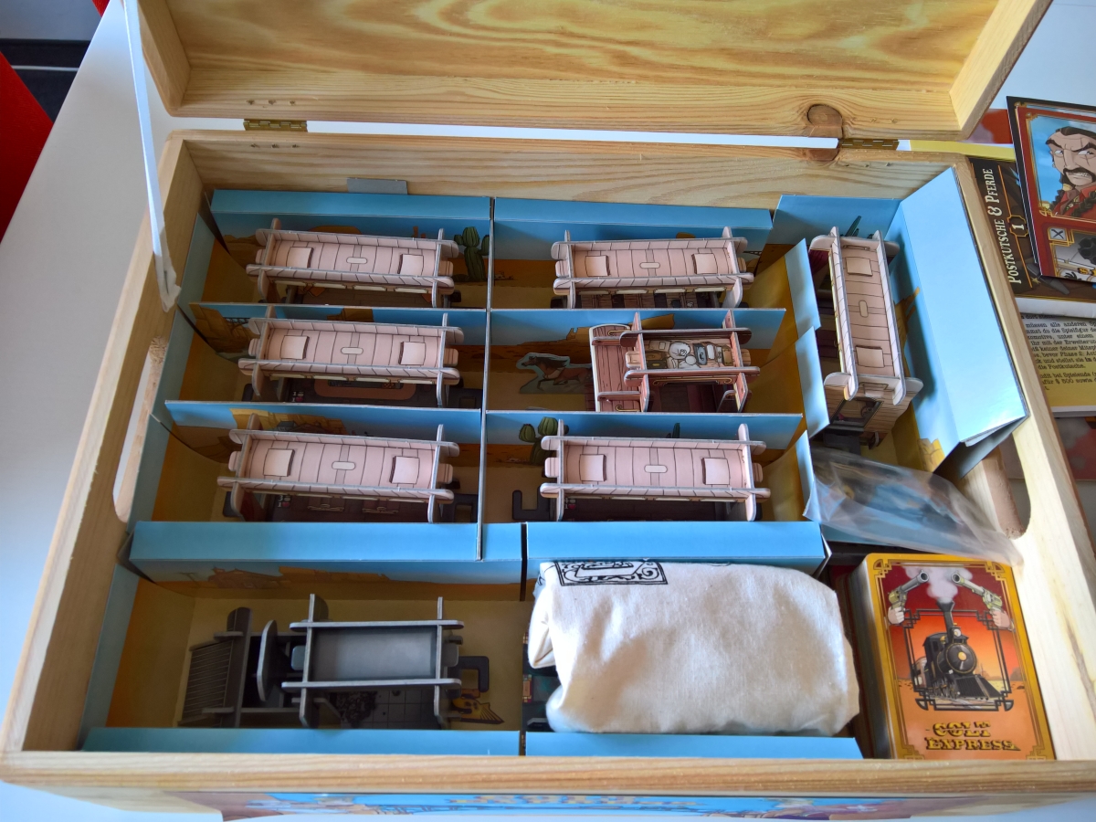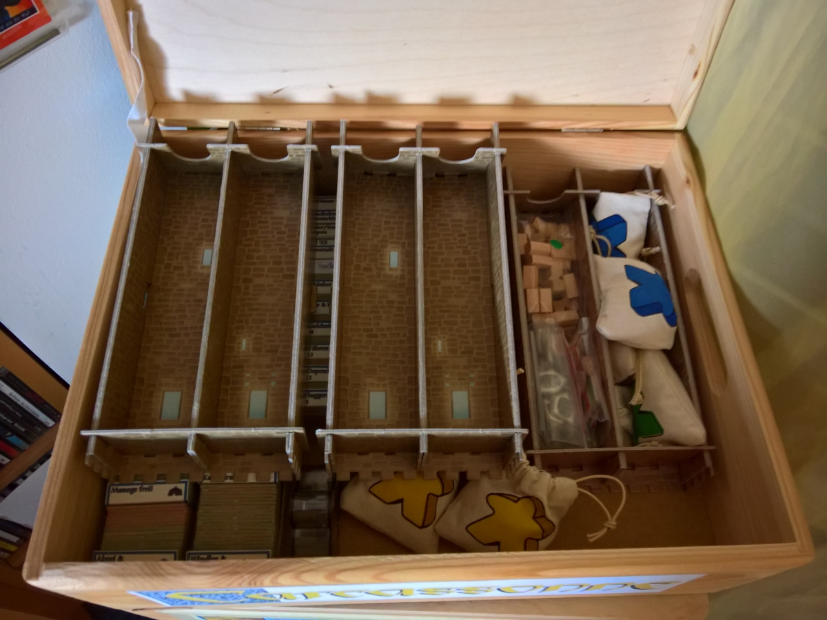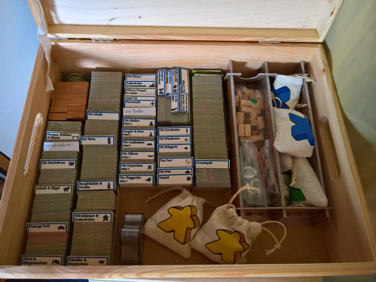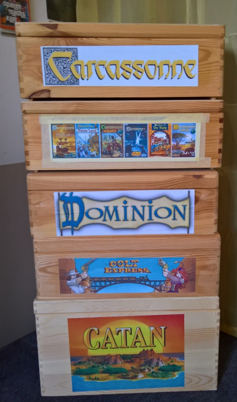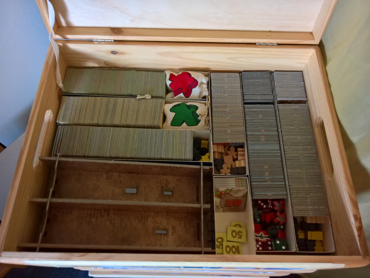 Ich bin schwer beeindruckt, was sich hier manche selbst zusammenbasteln. Da mir weder Geduld noch ruhige Hand zur Verfügung stehen, gibt es hier nicht so viel Selbstgebastelts. Beim Basteln liegt der Fokus daher mehr auf Funktionalität als auf Schönheit. Für Spiele, die den Rahmen jeder normalen Spieleschachtel sprengen, haben wir uns Holzboxen im Baumarkt gekauft: