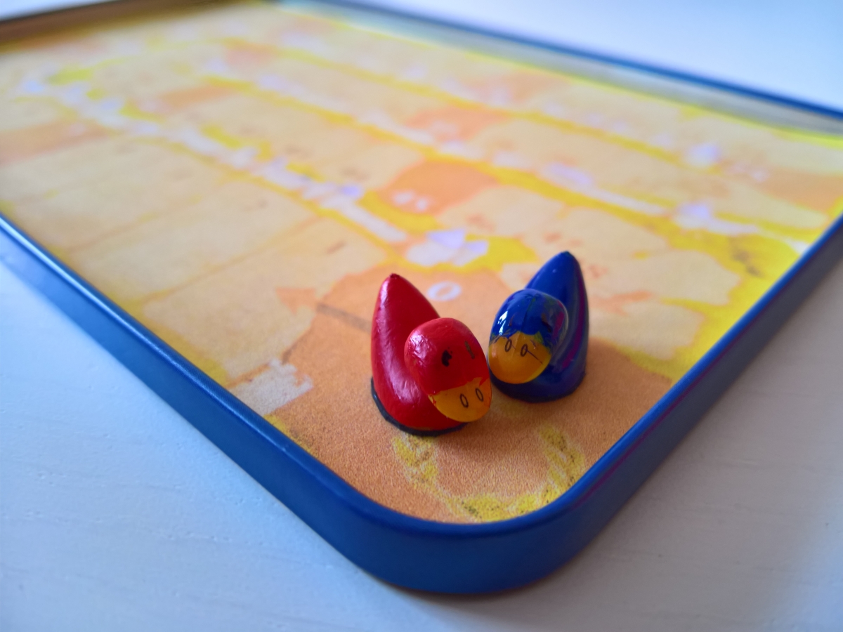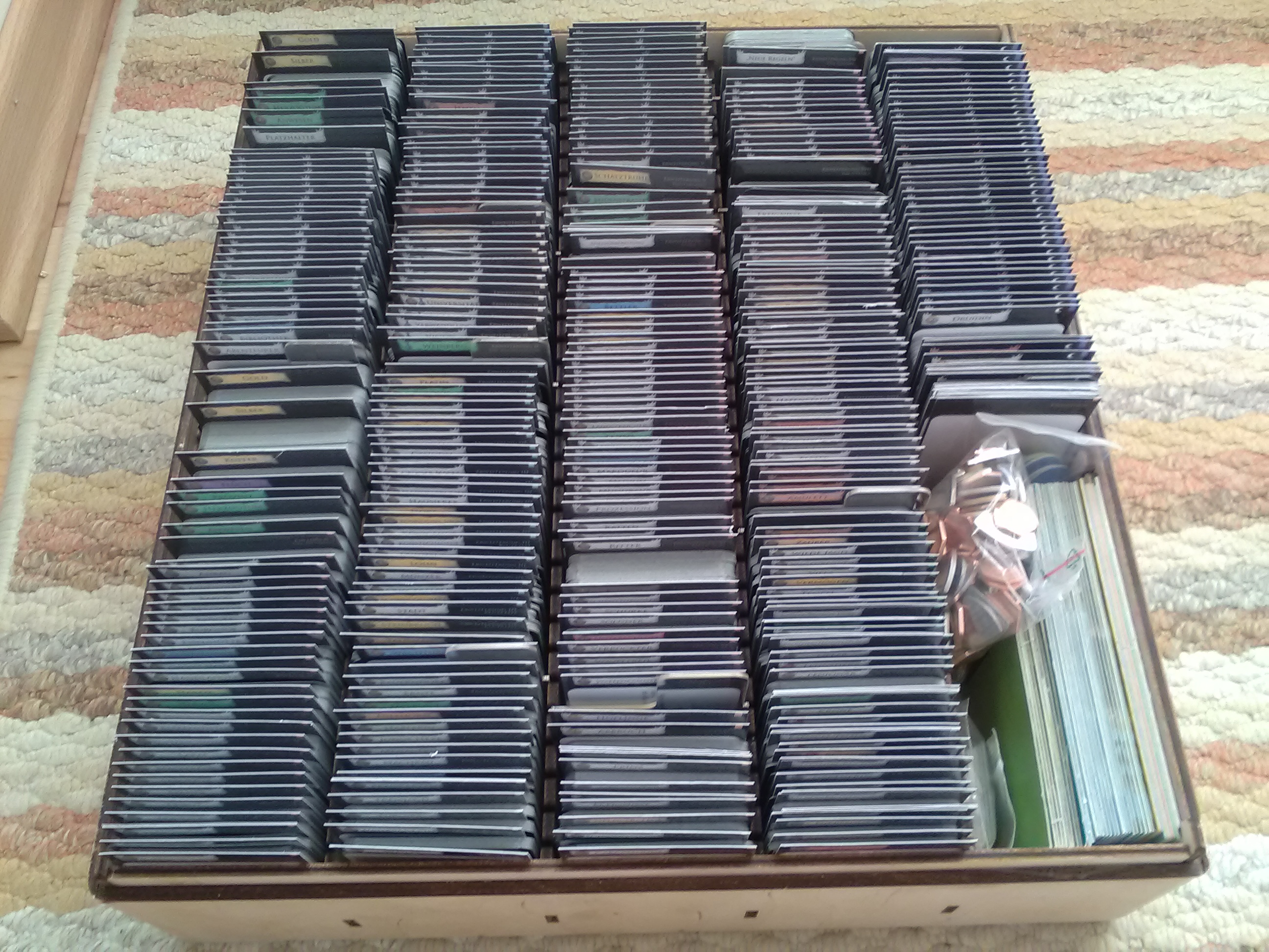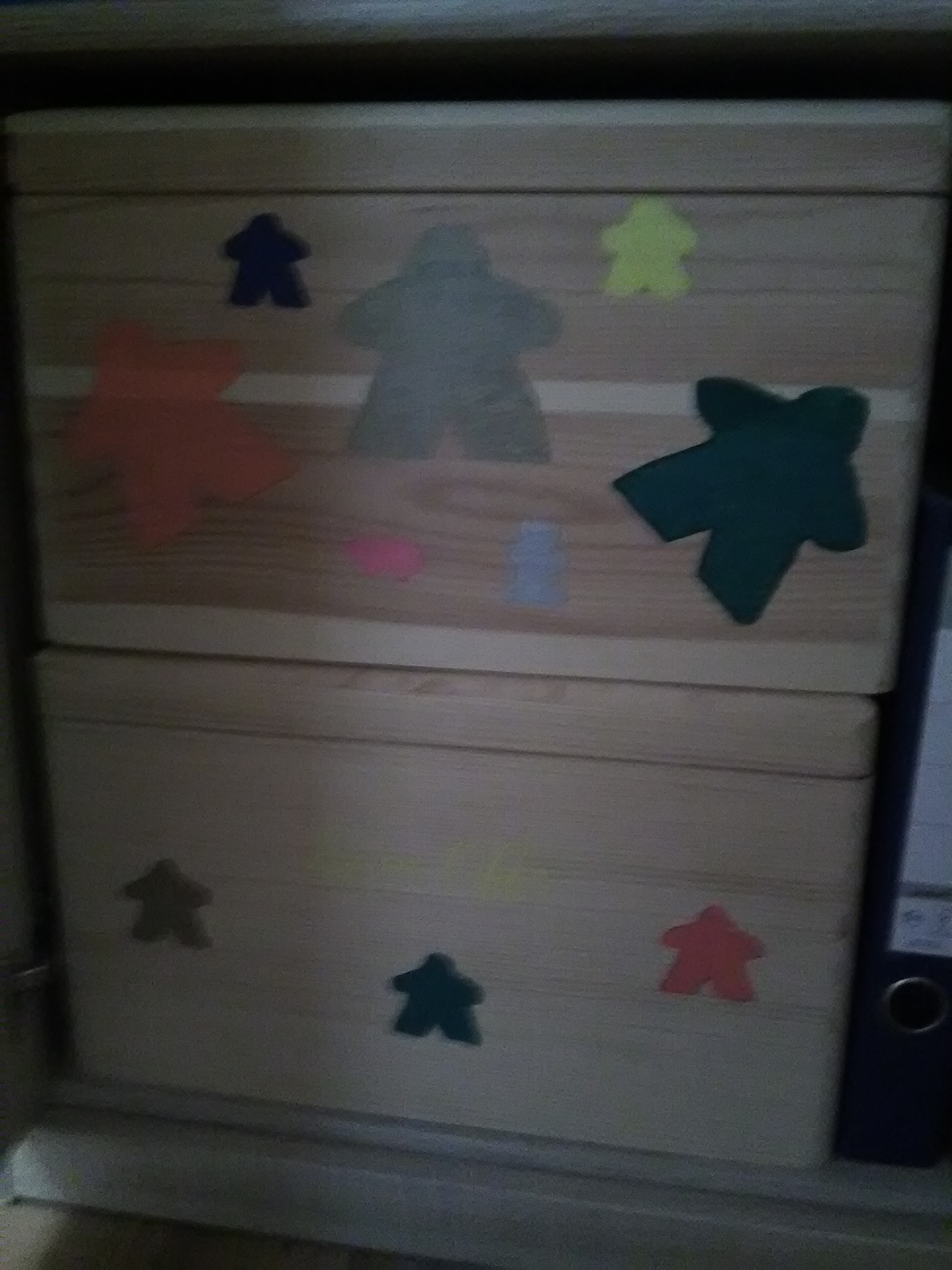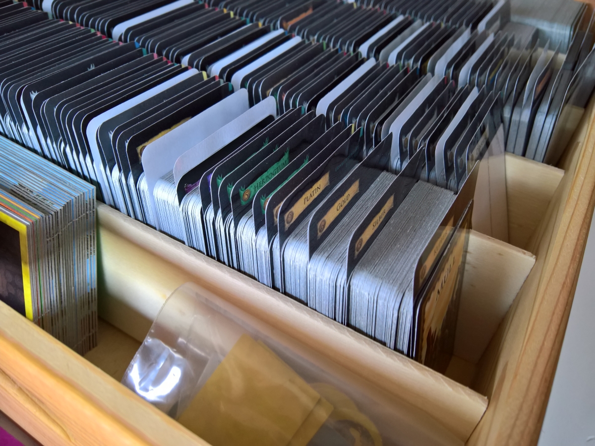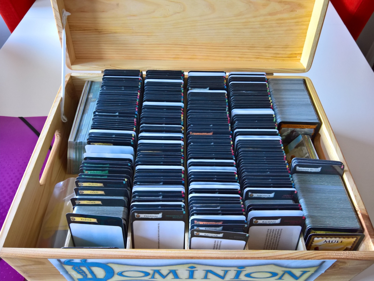 Ich bin schwer beeindruckt, was sich hier manche selbst zusammenbasteln. Da mir weder Geduld noch ruhige Hand zur Verfügung stehen, gibt es hier nicht so viel Selbstgebastelts. Beim Basteln liegt der Fokus daher mehr auf Funktionalität als auf Schönheit. Für Spiele, die den Rahmen jeder normalen Spieleschachtel sprengen, haben wir uns Holzboxen im Baumarkt gekauft: